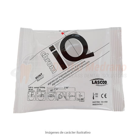 CON INDICADOR CROMÁTICO DE FASE DE FRAGUADO QUE INDICA TIEMPO DE MEZCLA, TIEMPO DE TRABAJO Y APLICACION EN BOCA Y TIEMPO FINAL DE FRAGUADO.